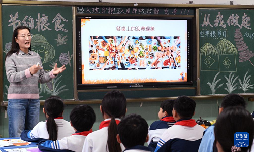 10月15日,河南省商丘市夏邑縣育才學(xué)校老師在世界糧食日主題班會(huì)上講解糧食知識(shí)。(新華社發(fā) 苗育才 攝)