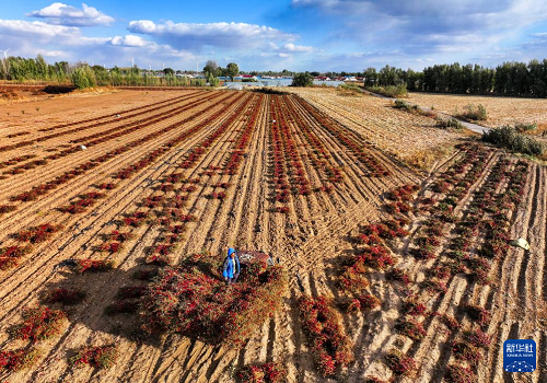 10月19日,在通遼市開魯縣東風(fēng)鎮(zhèn)六合堂村,村民在田地里收獲干椒(無人機照片)。(新華社記者 連振 攝)