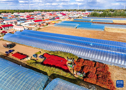 10月19日,在通遼市開魯縣東風(fēng)鎮(zhèn)六合堂村,村民在分揀紅干椒(無人機照片)。(新華社記者 連振 攝)