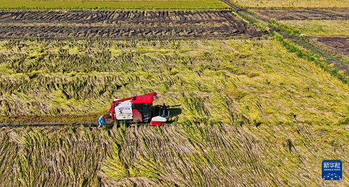 10月22日,湖南省衡陽市衡山縣白果鎮(zhèn)村民駕駛農(nóng)機(jī)收割晚稻(無人機(jī)照片)。(新華社發(fā) 曹正平 攝)