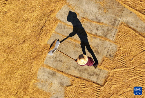 10月22日,農(nóng)民在江蘇里下河地區(qū)農(nóng)科所(揚(yáng)州市農(nóng)科院)晾曬稻谷(無人機(jī)照片)。(新華社發(fā) 孟德龍 攝)