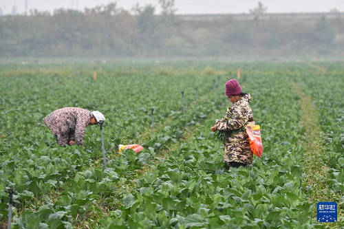 10月30日,菜農(nóng)在沅江市草尾鎮(zhèn)樂園村蔬菜田里采收蔬菜。(新華社記者 陳振海 攝)
