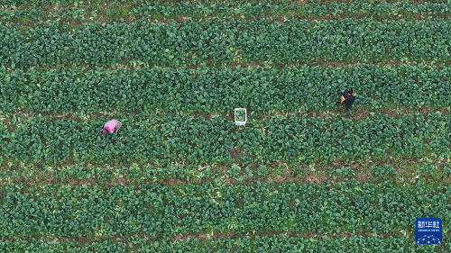 10月30日,菜農(nóng)在沅江市草尾鎮(zhèn)樂園村蔬菜田里采收蔬菜(無人機(jī)照片)。(新華社記者 陳振海 攝)