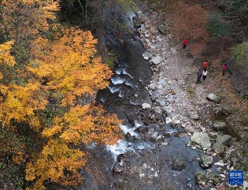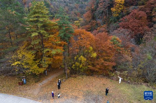11月5日,游人在位于漢中市南鄭區(qū)的黎坪國家森林公園內拍照游玩(無人機照片)。(新華社記者 邵瑞 攝)