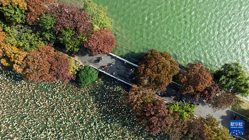 11月10日拍攝的南京玄武湖公園初冬景色(無人機(jī)照片)。(新華社發(fā) 孫忠南 攝)