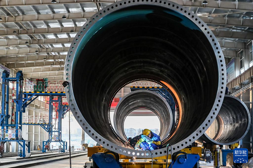 11月20日,在甘肅省酒泉經(jīng)濟(jì)技術(shù)開發(fā)區(qū)的中國(guó)水電四局(酒泉)新能源裝備有限公司塔筒制造車間,工作人員進(jìn)行風(fēng)機(jī)塔筒焊接作業(yè)。(新華社記者 郎兵兵 攝)
