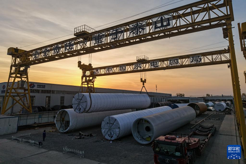 11月20日,在甘肅省酒泉經(jīng)濟(jì)技術(shù)開發(fā)區(qū)的中國(guó)水電四局(酒泉)新能源裝備有限公司裝運(yùn)生產(chǎn)線上,工作人員進(jìn)行風(fēng)機(jī)塔筒吊裝作業(yè)(無人機(jī)照片)。(新華社記者 郎兵兵 攝)