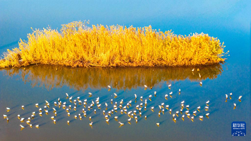 12月8日,群鳥(niǎo)在江蘇興化里下河國(guó)家濕地公園內(nèi)棲息、覓食(無(wú)人機(jī)照片)。(新華社發(fā) 周社根 攝)