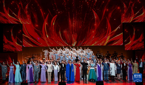 12月16日,在北京二七劇場(chǎng)舉辦的“中國(guó)夢(mèng)·勞動(dòng)美”2026新年音樂會(huì)上,演員在大合唱《億萬職工心向黨》中歌唱。(新華社記者 才揚(yáng) 攝)