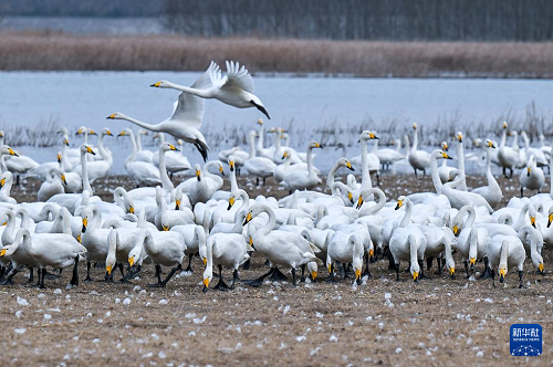 進(jìn)入冬季,大批白天鵝來(lái)到河南省三門(mén)峽市黃河濕地棲息越冬。近年來(lái),隨著當(dāng)?shù)夭粩嗉訌?qiáng)黃河沿岸濕地生態(tài)保護(hù)工作,白天鵝的數(shù)量逐年增加。目前,三門(mén)峽黃河岸邊40余萬(wàn)畝淺灘濕地已迎來(lái)萬(wàn)余只白天鵝。
