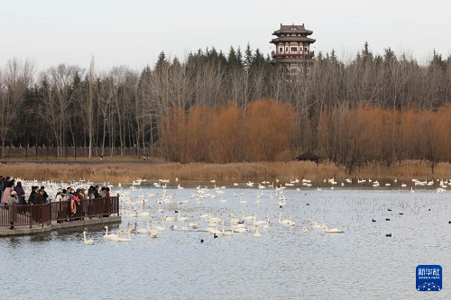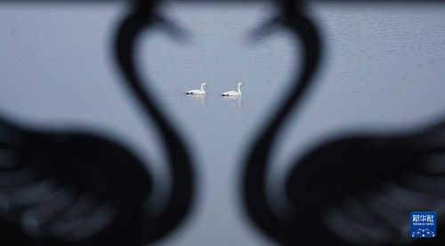 12月20日,游客在河南省三門(mén)峽市天鵝湖國(guó)家城市濕地公園觀賞天鵝。(新華社發(fā) 何五昌 攝)
