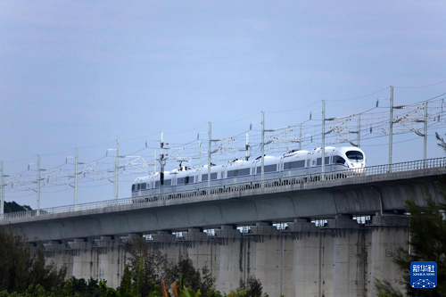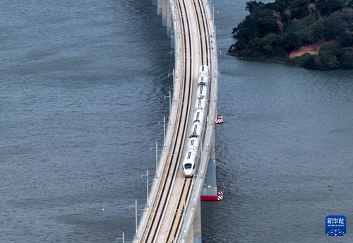 這是12月22日拍攝的行駛在汕頭濠江特大橋上的高鐵列車。(新華社發(fā) 姚軍 攝)