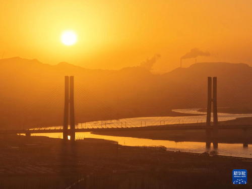 12月23日在日出時(shí)分拍攝的包銀高鐵烏海黃河特大橋。(新華社記者 邢廣利 攝)