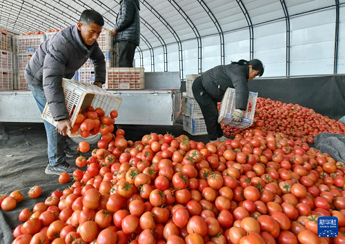 12月29日,肅寧縣萬里鎮(zhèn)一家蔬菜種植合作社的社員在分揀收獲的西紅柿。(新華社記者 楊世堯 攝)
