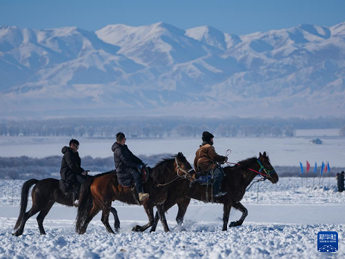 1月3日,在新疆昭蘇濕地公園,游客在當?shù)啬撩瘢ㄓ遥ьI(lǐng)下體驗雪地騎馬。(新華社記者 胡虎虎 攝)