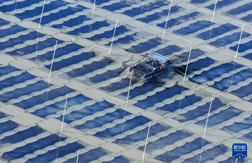 1月8日,漁民在江蘇連云港市海州灣漁場養(yǎng)殖區(qū)收獲條斑紫菜(無人機(jī)照片)。(新華社發(fā) 王健民 攝)