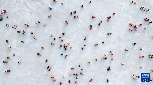 1月17日,市民在銀川文旅集團覽山公園落日冰場玩耍(無人機照片)。(新華社記者 王鵬 攝)