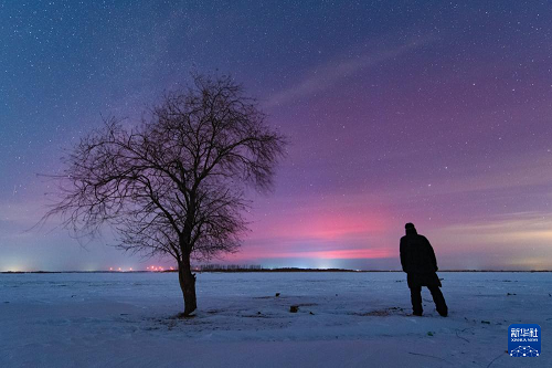 1月20日在位于黑龍江省黑河市的北大荒集團(tuán)北安分公司二龍山農(nóng)場有限公司拍攝的絢麗極光。(新華社發(fā) 錢泊羽 攝)