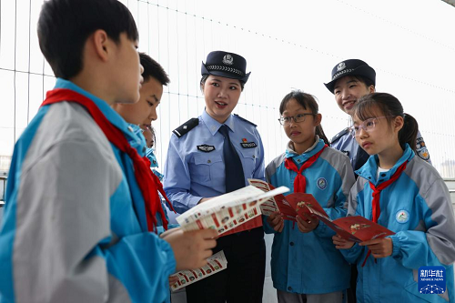 4月14日,在貴州省銅仁市玉屏侗族自治縣第四小學(xué),民警給學(xué)生講解國家安全知識。(新華社發(fā) 胡攀學(xué) 攝)