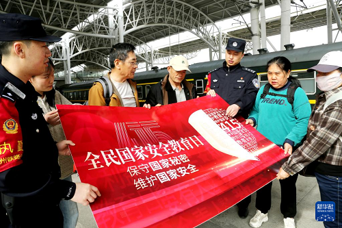 4月14日,江蘇徐州鐵路公安處連云港東站派出所民警為旅客講解國家安全知識。(新華社發(fā) 王春 攝)