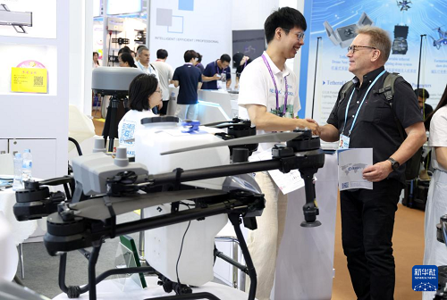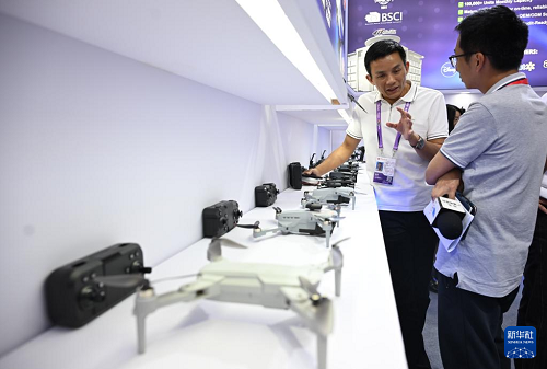 4月15日,外商在廣交會現(xiàn)場參觀咨詢無人機(jī)產(chǎn)品。(新華社記者 盧漢欣 攝)