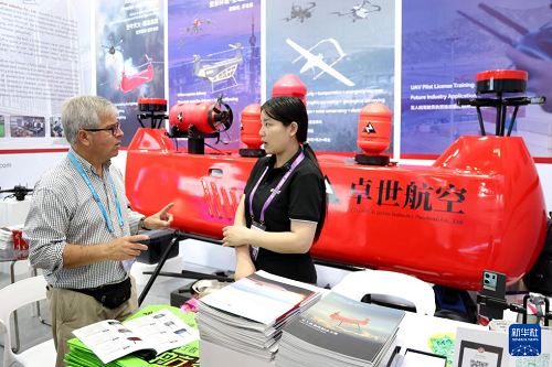 4月15日,外商在廣交會現(xiàn)場咨詢了解消防無人機(jī)。(新華社記者 盧漢欣 攝)