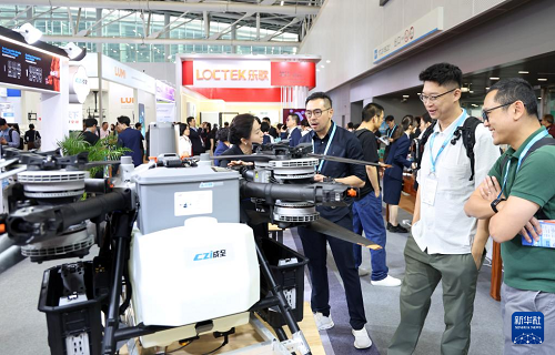 4月15日,采購商在廣交會現(xiàn)場參觀選購無人機(jī)。(新華社記者 盧漢欣 攝)