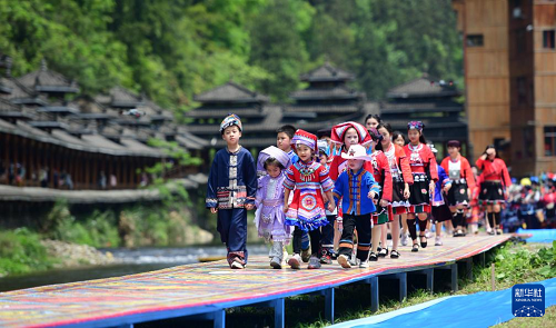 4月19日,在廣西桂林市龍勝各族自治縣龍脊鎮(zhèn)金江村黃洛瑤寨,小朋友身著民族服裝參加“T臺(tái)秀”。(新華社發(fā) 潘志祥 攝)