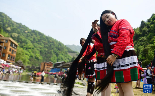 4月19日,在廣西桂林市龍勝各族自治縣龍脊鎮(zhèn)金江村黃洛瑤寨,瑤族婦女在河邊展示長(zhǎng)發(fā)梳妝。(新華社發(fā) 潘志祥 攝)