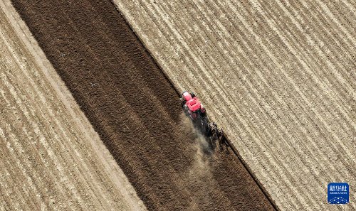 4月17日,在通遼市科爾沁左翼中旗花吐古拉鎮(zhèn),農(nóng)機(jī)手駕駛農(nóng)機(jī)翻地(無人機(jī)照片)。(新華社記者 連振 攝)