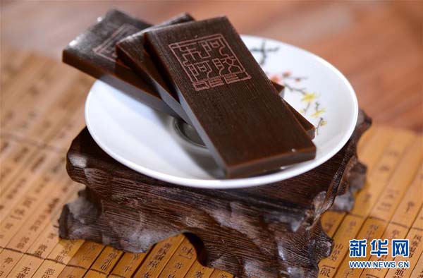 這是山東東阿縣一家阿膠企業(yè)生產(chǎn)的阿膠藥品(2015年12月28日攝)。新華社記者 周科 攝