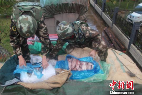 圖為邊防官兵在可疑貨車(chē)內(nèi)發(fā)現(xiàn)大量走私凍品。 楊添 攝