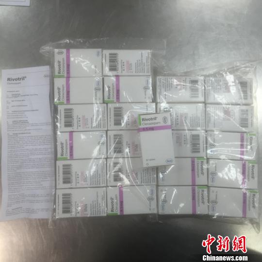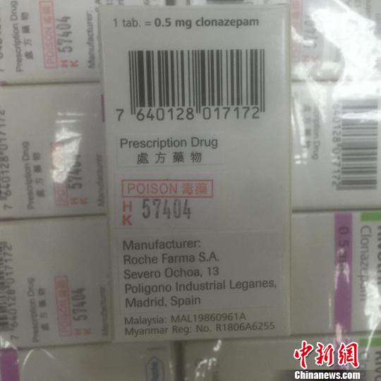 經(jīng)查驗發(fā)現(xiàn),背包內(nèi)放置著23盒嶄新的藥物,共計1.4千克。這些藥物分四排用透明塑料紙纏繞,每個盒子內(nèi)裝有一個塑料藥瓶,內(nèi)有50片藥丸。藥盒上及內(nèi)部的說明書均為外文印刷。在最外面包裝上,貼著用中文繁體字印刷的“毒藥”和“處方藥物”字樣。關(guān)員立刻查閱了藥品說明,發(fā)現(xiàn)這些藥物居然是被稱為“最強安眠藥”的氯硝西泮。