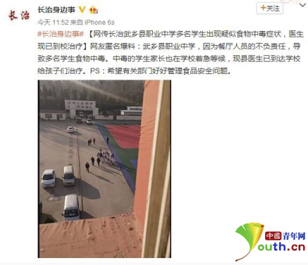 中國青年網(wǎng)記者就此事向武鄉(xiāng)縣職業(yè)中學(xué)進行求證,該校辦公室劉老師稱,目前有二十余位同學(xué)在縣人民醫(yī)院住院治療。事情發(fā)生后學(xué)校領(lǐng)導(dǎo)高度重視,縣領(lǐng)導(dǎo)和教育局領(lǐng)導(dǎo)也都前往醫(yī)院看望生病學(xué)生。