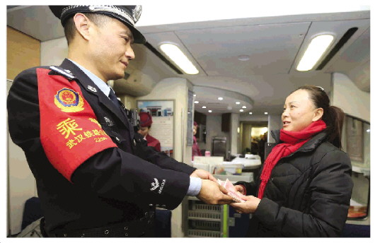 圖為武漢鐵路公安局武漢公安處乘務(wù)二大隊(duì)乘警魏國(guó)強(qiáng)(左)將找到的遺失錢財(cái)交給失主。趙軍 攝