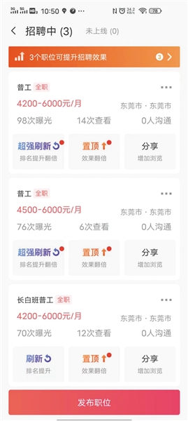 吳林提到,他們購(gòu)買企業(yè)招聘賬戶后,還要花錢請(qǐng)人在招聘平臺(tái)上代發(fā)招聘帖,“發(fā)招聘帖特別嚴(yán)格,發(fā)不好就封賬號(hào),發(fā)帖后,怎么能在平臺(tái)上排到最前面,也是需要重點(diǎn)考慮的?!?/span>