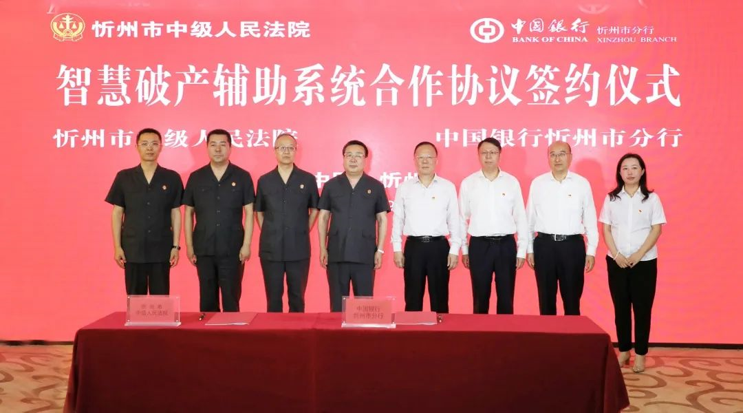 為扎實開展“我為群眾辦實事”實踐活動,助力創(chuàng)建全市“六最”營商環(huán)境,忻州中院持續(xù)加強破產(chǎn)審判信息化建設(shè),與中國銀行忻州分行聯(lián)合研發(fā)了山西省首個“破產(chǎn)案件智慧輔助系統(tǒng)”,努力實現(xiàn)破產(chǎn)審判的“高效、便利、透明”作用,全面完善智慧破產(chǎn)體系建設(shè)。9月17日,忻州中院與中國銀行忻州分行舉行簽約儀式,中國銀行山西省分行黨委委員、副行長馬軍保,中院黨組書記、院長劉碩才,中國銀行山西省分行行政事業(yè)機構(gòu)部總經(jīng)理陳鈺,中院副院長趙海生,中國銀行忻州市分行黨委委員、副行長武雁淳以及中國銀行忻州市分行城區(qū)網(wǎng)點及部門負(fù)責(zé)人,中院相關(guān)部門負(fù)責(zé)人參加簽約儀式。中院黨組副書記、副院長劉瑞光與中國銀行忻州市分行黨委書記、行長閆錦平現(xiàn)場簽訂破產(chǎn)審判智慧輔助系統(tǒng)建設(shè)合作協(xié)議。