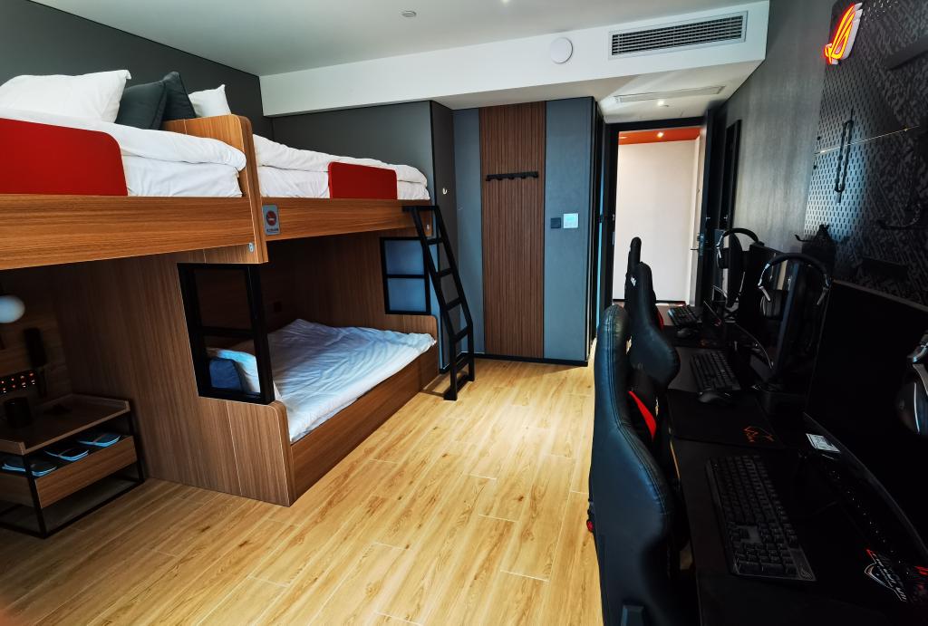 來(lái)自湖北的韓先生出差入住上海市長(zhǎng)寧區(qū)的一家電競(jìng)酒店,他說(shuō):“晚上打打電競(jìng)也是一種放松?!边@家電競(jìng)酒店共有40多間客房,含大床房、雙床房和多床房,每個(gè)房間都會(huì)對(duì)應(yīng)配備專(zhuān)業(yè)級(jí)電腦。除了像韓先生這樣的客人,還有多個(gè)電競(jìng)戰(zhàn)隊(duì)在此集訓(xùn)包房數(shù)月,隊(duì)員們吃喝起居都在這里。