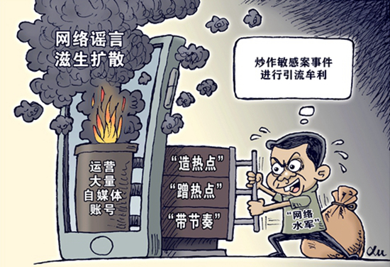 編造傳播虛假信息“造熱點”“蹭熱點”“帶節(jié)奏”,炒作敏感案事件進行引流牟利,開設(shè)假冒媒體網(wǎng)站和自媒體賬號,打著“輿論監(jiān)督”等旗號,實施敲詐勒索……這些行為被公安機關(guān)嚴厲打擊。徐駿/作(新華社發(fā))