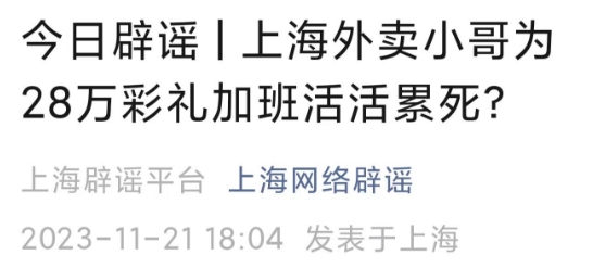 11月20日,上海網(wǎng)絡(luò)辟謠微信官方賬號(hào)發(fā)布辟謠文章。針對(duì)近日網(wǎng)傳“為掙28萬彩禮娶媳婦,上海外賣小哥活活累死”一事,經(jīng)過核查發(fā)現(xiàn),事件純屬自媒體捏造散布。