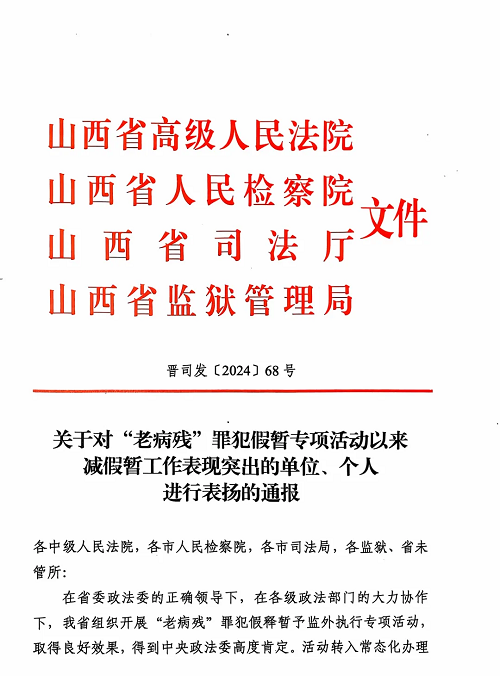 近日,山西省高級(jí)人民法院、山西省人民檢察院、山西省司法廳、山西省監(jiān)獄管理局印發(fā)《關(guān)于對“老病殘”罪犯假暫專項(xiàng)活動(dòng)以來減假暫工作表現(xiàn)突出的單位、個(gè)人進(jìn)行表揚(yáng)的通報(bào)》,對減假暫工作表現(xiàn)突出的16家單位和25名個(gè)人予以通報(bào)表揚(yáng),忻州中院審判監(jiān)督庭獲評“全省減假暫工作表現(xiàn)突出單位”。