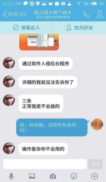 記者以求購機(jī)票信息為名在網(wǎng)上找到了十幾名以此為業(yè)的QQ用戶。其中,用戶名為“能力越大脾氣越大”的用戶告訴記者,每條航空機(jī)票信息售價18元,可以挑選特定的航空公司,買多了,價格還可以優(yōu)惠。他告訴記者,自己是通過軟件入侵后臺程序“調(diào)取”機(jī)票信息,而且都是客戶有需求的時候才去“調(diào)取”,保證信息新鮮有效。