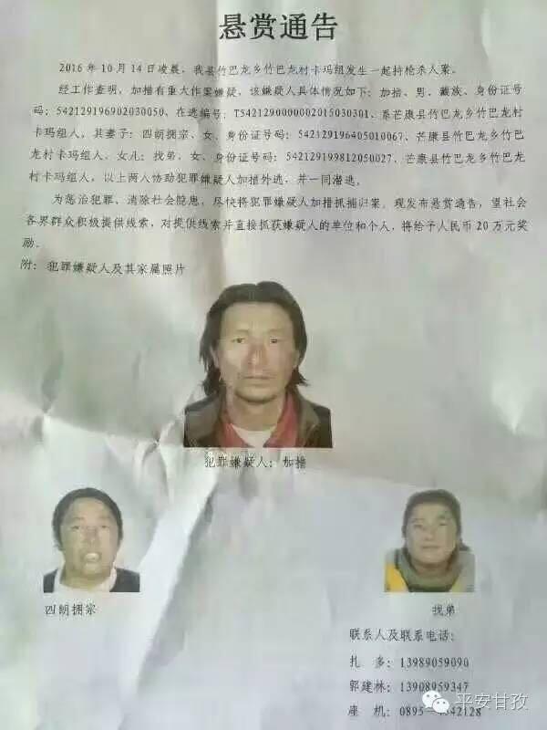10月18日,甘孜藏族自治州公安局通過官方認證微信“平安甘孜”發(fā)布的通緝令顯示,經工作查明,加措有重大作案嫌疑。加措生于1969年2月3日,芒康縣竹巴龍鄉(xiāng)竹巴龍村卡瑪組人,在逃編號為“T5421290000002015030301”。其妻子四朗擁宗和女兒找弟協(xié)助犯罪嫌疑人加措外逃,并一同潛逃。