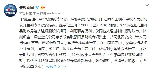 人民網(wǎng)北京1月23日電 據(jù)中央電視臺新聞中心官方微博消息,江西省上饒市中級人民法院公開宣判李華波貪污案。