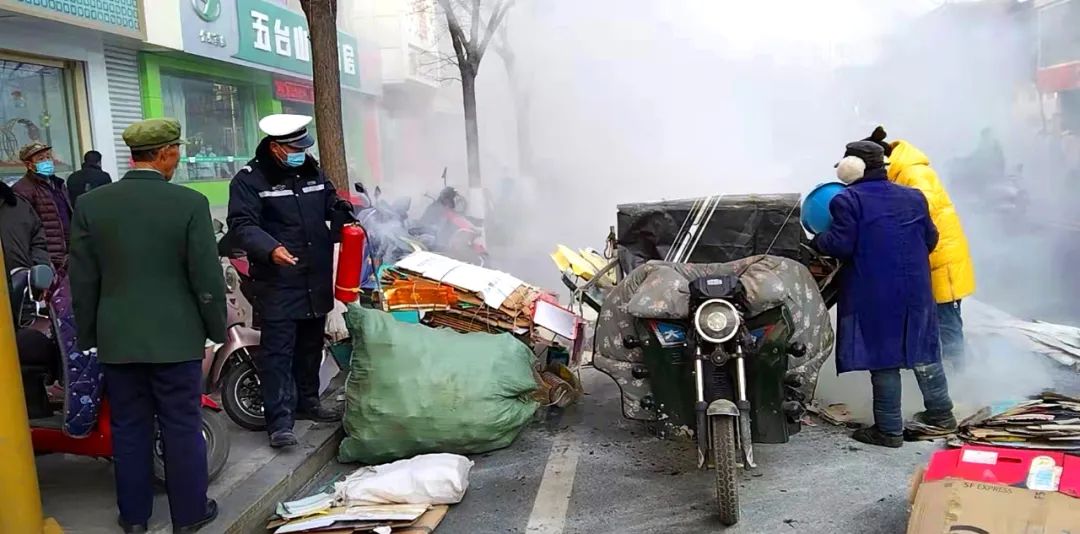 正在執(zhí)勤的兩名交警李春生、胡翔忽然聞到一股煙味,仔細(xì)查看四周,原來(lái)是停在路口等待紅燈的一輛三輪車(chē)上冒起白煙,整車(chē)的廢紙片就要燃起,但三輪車(chē)駕駛員仍未察覺(jué)。