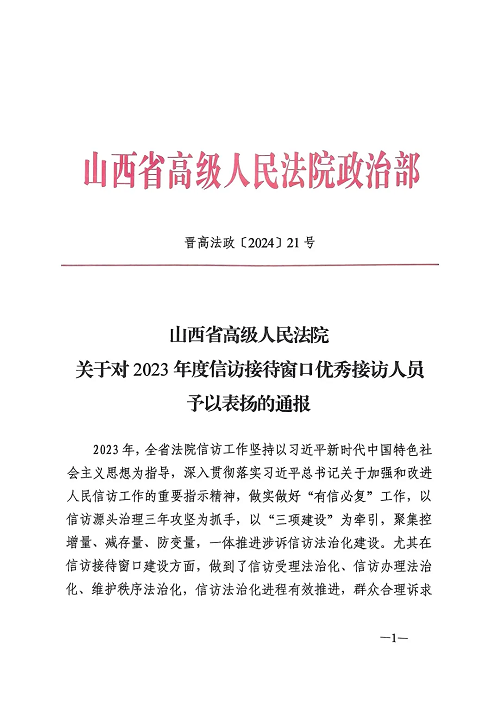 近日,山西省高級(jí)人民法院下發(fā)《關(guān)于對(duì)2023年度信訪接待窗口優(yōu)秀接訪人員予以表?yè)P(yáng)的通報(bào)》,忻州法院2名干警榜上有名。忻州中院黨組書(shū)記、院長(zhǎng)栗向東作出批示,要求全市法院干警以受到表?yè)P(yáng)的同志為榜樣,愛(ài)崗敬業(yè),爭(zhēng)當(dāng)先進(jìn),爭(zhēng)創(chuàng)一流工作業(yè)績(jī)。
