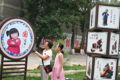 7月18日,原平市的家長(zhǎng)正在忠孝園圖文并茂的宣傳圖畫前給孩子講解。該市通過(guò)多種形式的方法宣傳忠孝文化,讓市民們更加了解其傳統(tǒng)孝文化的內(nèi)涵和傳統(tǒng)美德,代代相傳,煥發(fā)起人們更加熱愛(ài)祖國(guó)和熱愛(ài)人民。(趙春曉 攝)
