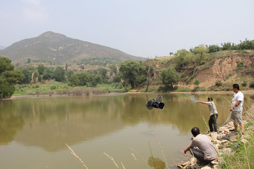 “昔日有水水白流、只見黃土不見魚”的五臺縣陽白鄉(xiāng)桑院村,在五臺農(nóng)商銀行陽白支行信貸人員的倡導(dǎo)下,依靠“項(xiàng)目攻堅(jiān)”、“金融扶貧”、“農(nóng)貸進(jìn)萬家”等惠民政策,在黃土塬上打壩蓄水建起20畝魚塘,投放鯉魚、白鰱魚等魚苗2萬尾,3斤以上的鮮魚已讓山里人大飽口福。圖為網(wǎng)袋捕魚。(俊賢 鄭光 先良)
