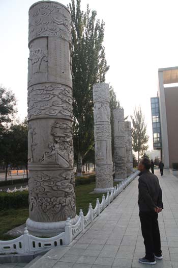 10月9日,原平市民在范亭文體廣場(chǎng)聚落的柱式雕塑前觀看愛國名將續(xù)范亭、東晉名士郝隆等16位名人紀(jì)念雕像。近年來,該市著力打造文化強(qiáng)市,利用柱式雕塑像繪制歷史文化名人、抗日英雄等群體形象,營造濃濃的文化氛圍。(褚震 攝)