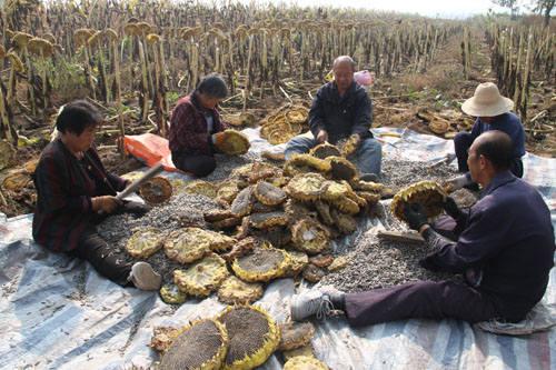 10月13日,原平市解村鄉(xiāng)圪坨村林同種植專(zhuān)業(yè)合作社正在收獲向日葵,該社引進(jìn)三瑞公司種植1000余畝SH363向日葵喜獲豐收。近年來(lái),該市積極引導(dǎo)農(nóng)民調(diào)整農(nóng)業(yè)產(chǎn)業(yè)結(jié)構(gòu),采取“合作社+農(nóng)戶(hù)”的模式,向日葵比玉米收入高四倍,銷(xiāo)售價(jià)每斤4塊左右,合作社為農(nóng)戶(hù)提供種子、種植技術(shù)等服務(wù),帶動(dòng)當(dāng)?shù)厝罕娫鍪罩赂弧?span style="font-family: 楷體,楷體_gb2312, simkai">圖為解村鄉(xiāng)村民趁著秋高氣爽的晴好天氣,在田間地頭葵花籽的情景。(褚震 攝)